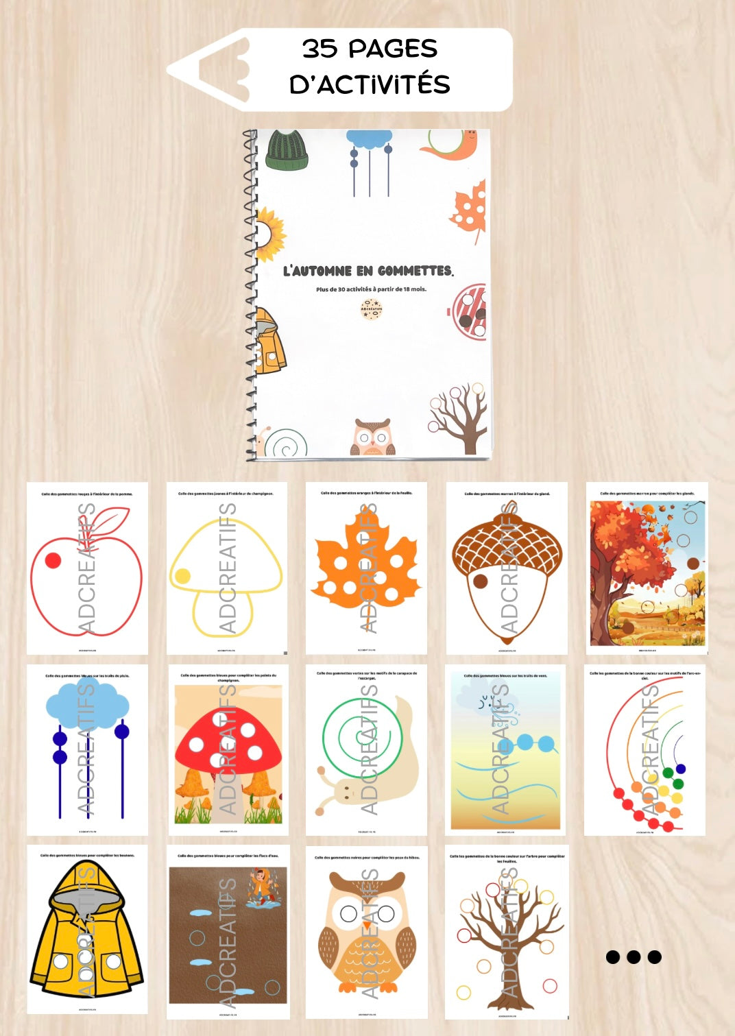 Ce livret de 35 activités sur le thème de l’automne est conçu pour éveiller et amuser les tout-petits. Il est imprimé avec une couverture et une dernière page plastifiées pour plus de résistance, tandis que les pages intérieures restent non plastifiées afin de faciliter l’utilisation des gommettes.